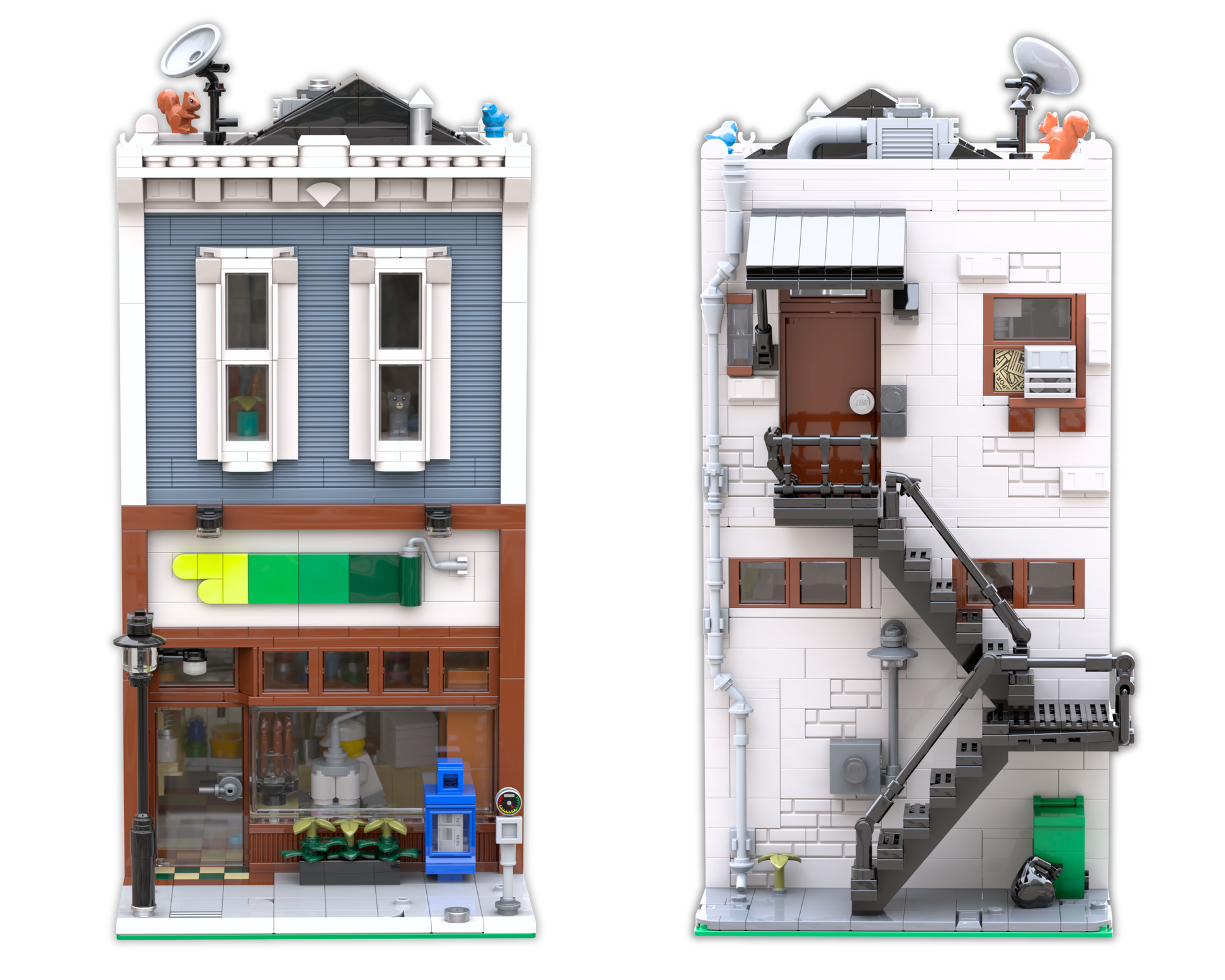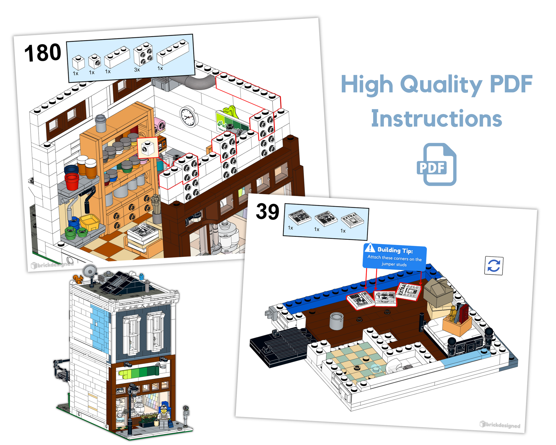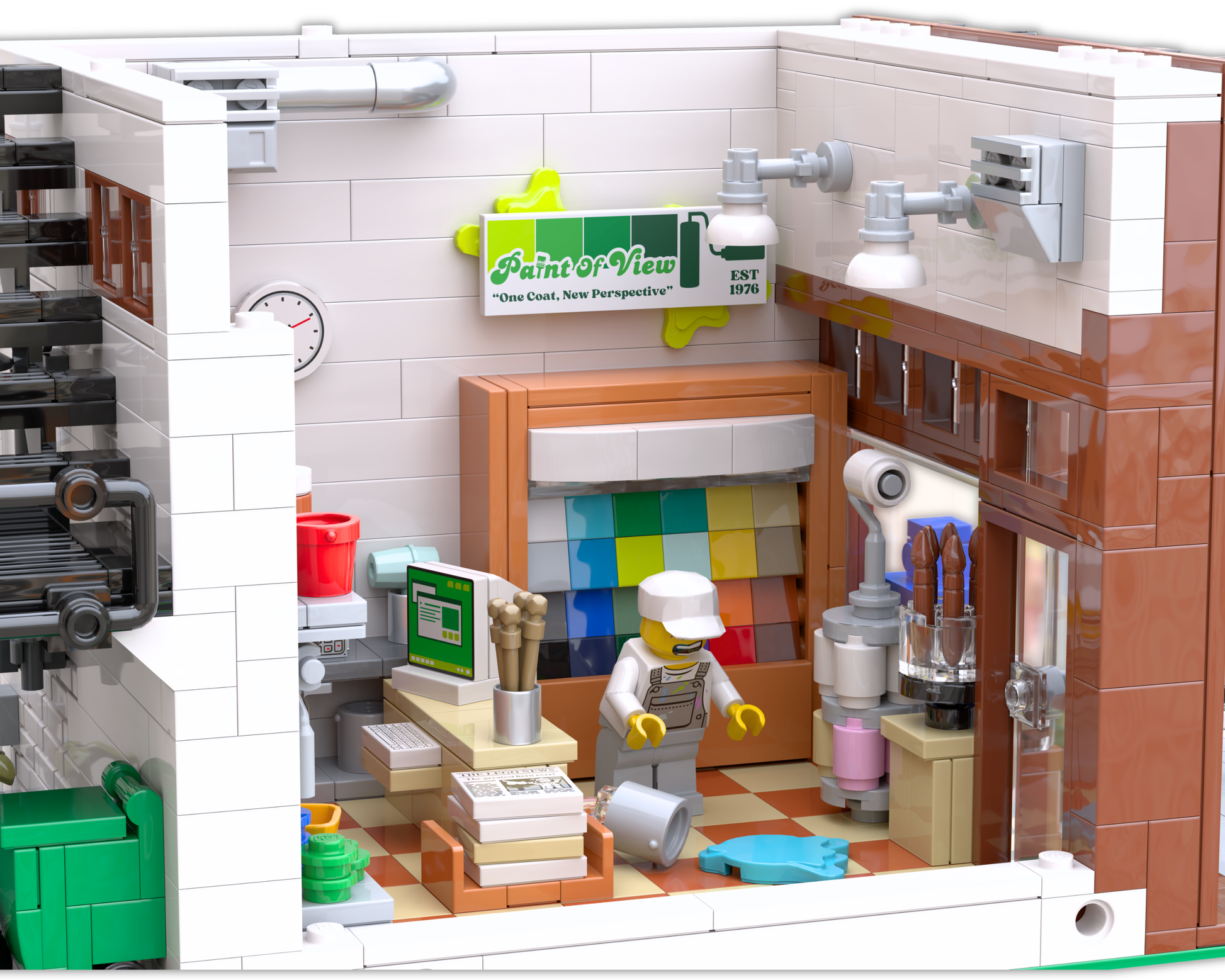 This two-story modular building features a small paint store with a studio apartment above it that is in the process of being repainted. Each level contains removable walls for easy access to the interior. Built on a 16×32 stud base, it fits seamlessly into any LEGO city, adding downtown vintage charm and countless unique details.
