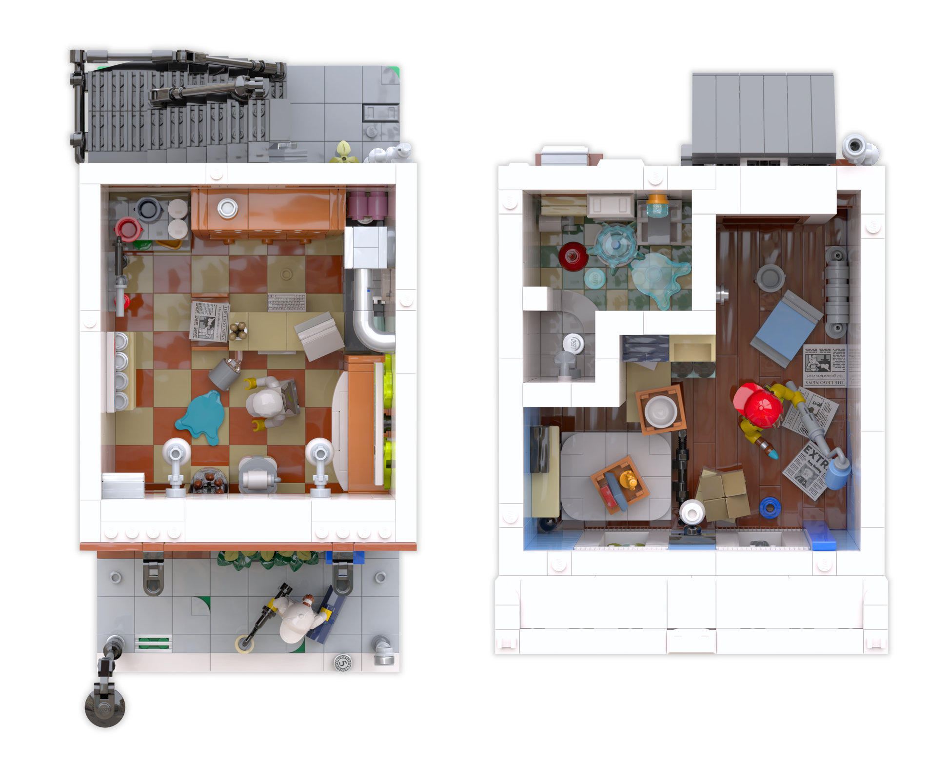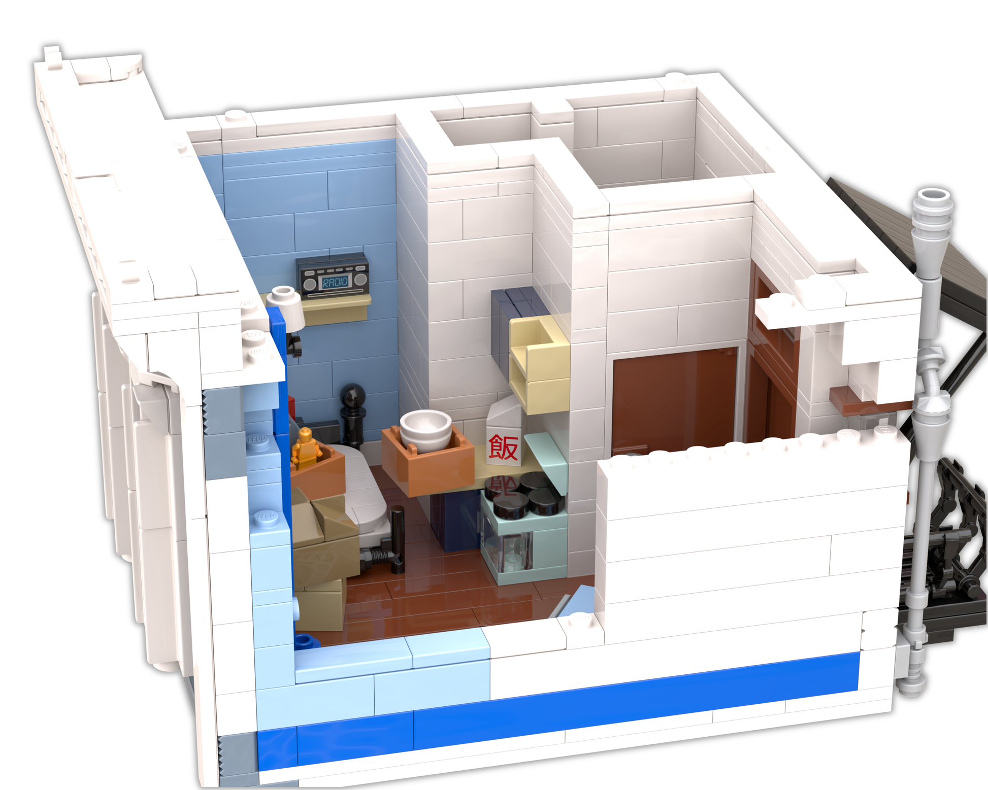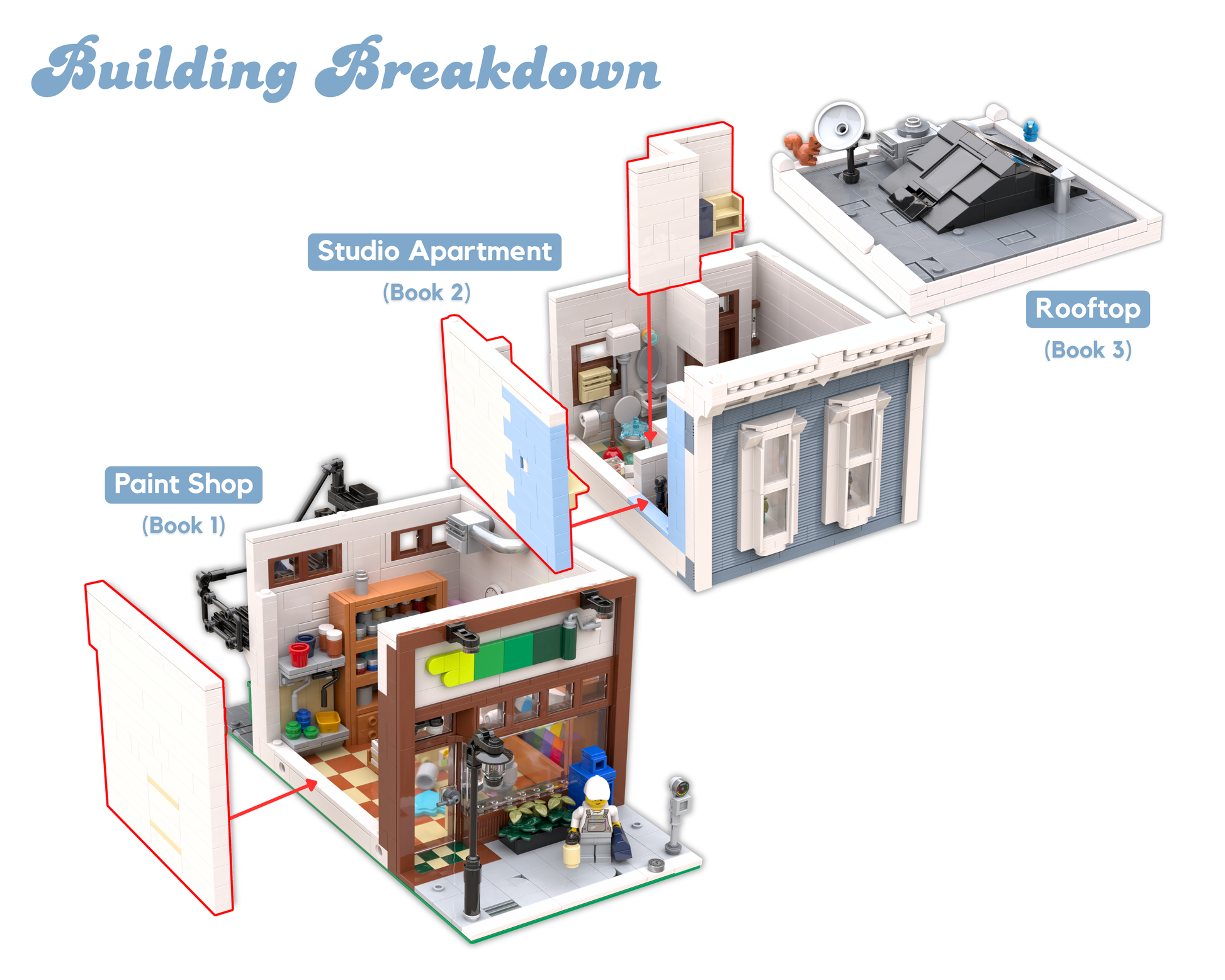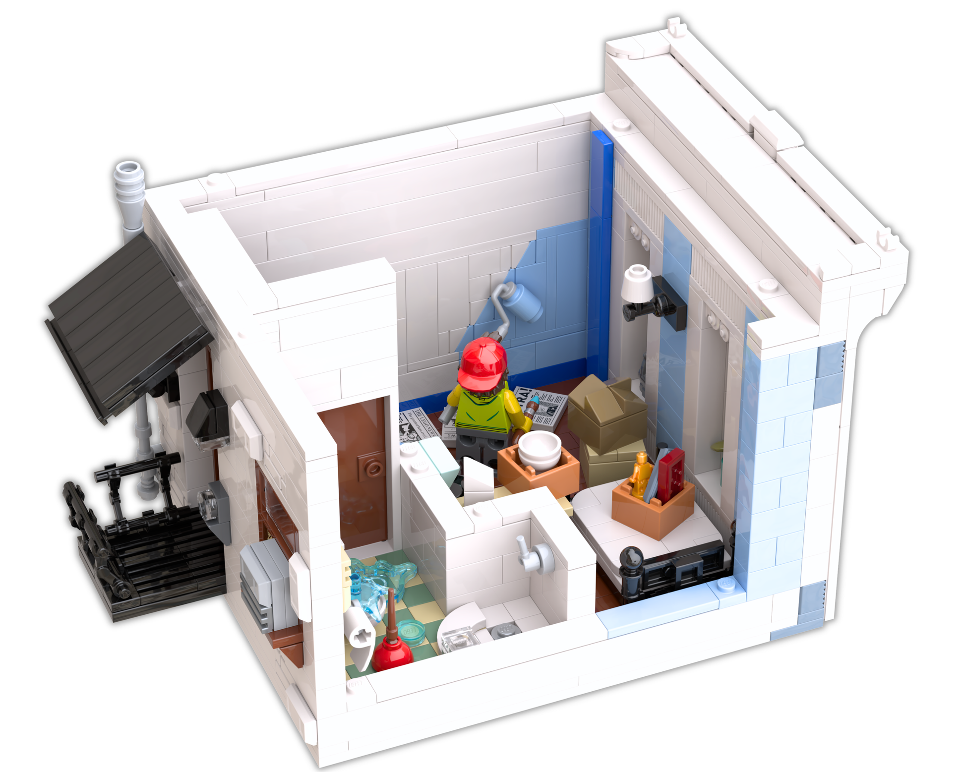 This two-story modular building features a small paint store with a studio apartment above it that is in the process of being repainted. Each level contains removable walls for easy access to the interior. Built on a 16×32 stud base, it fits seamlessly into any LEGO city, adding downtown vintage charm and countless unique details.