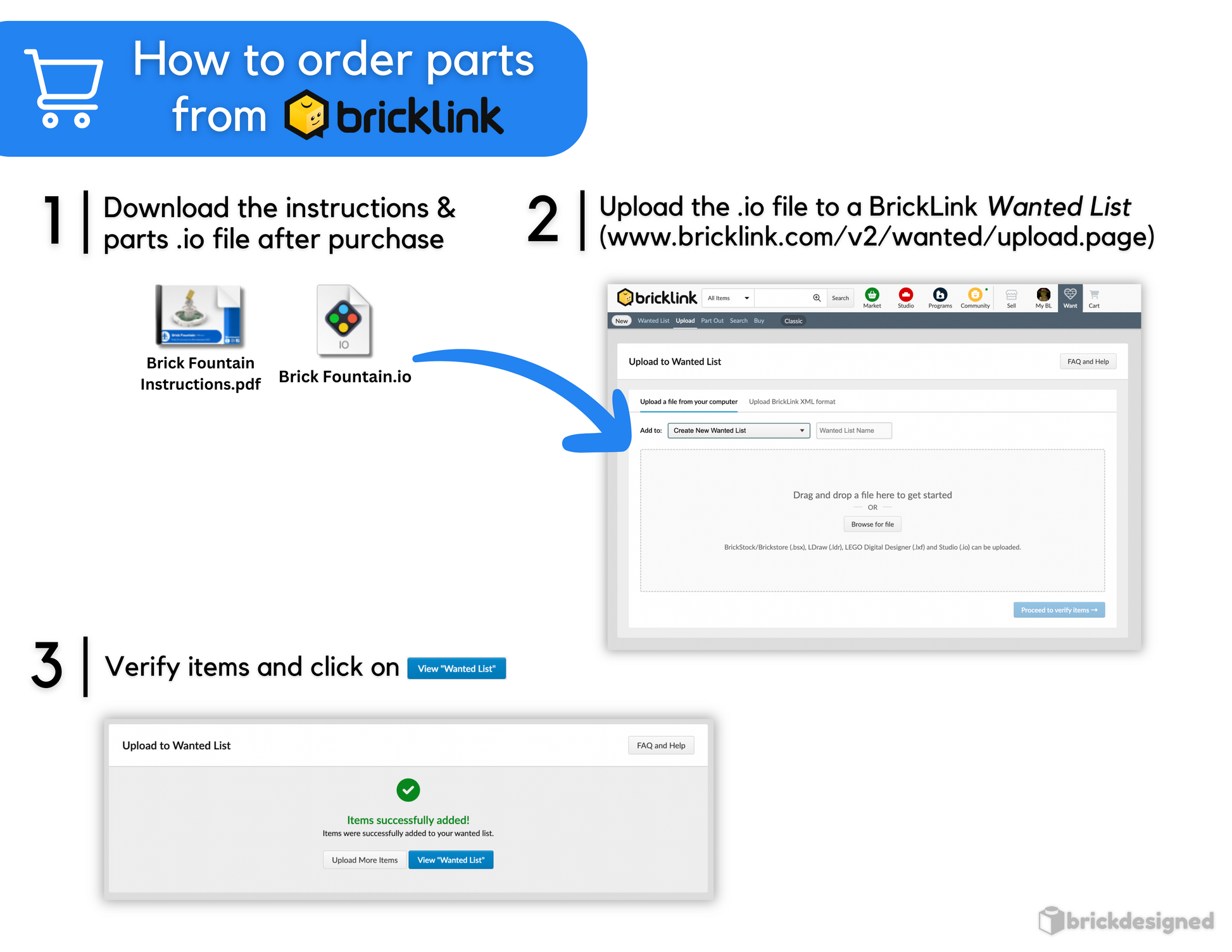 Your digital purchase will be delivered via email with a link to download the files. The download includes both the PDF Instructions File and a .io Parts File for you to easily upload to Bricklink.com to order parts.